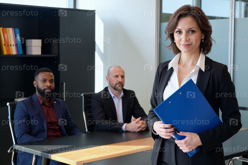Уверенная в себе молодая взрослая женщина ведет деловую встречу с коллегами