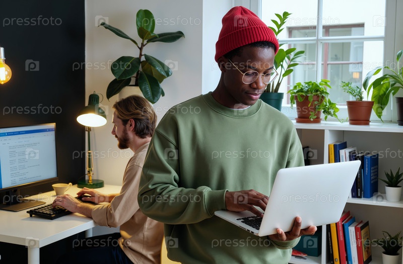 Молодой чернокожий человек использует ноутбук, в то время как мужчина работает за столом в офисе