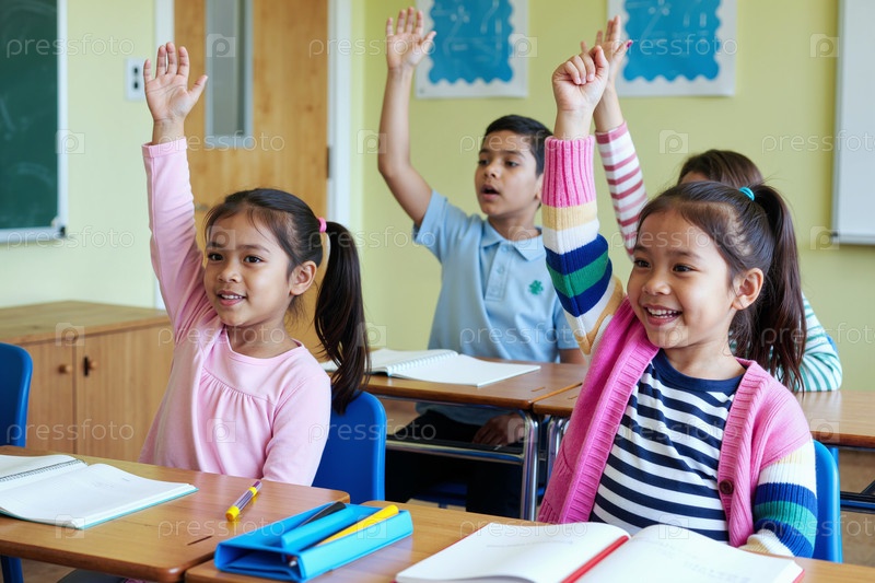 Мультиэтническая группа детей, поднимающих руки во время участия в классе