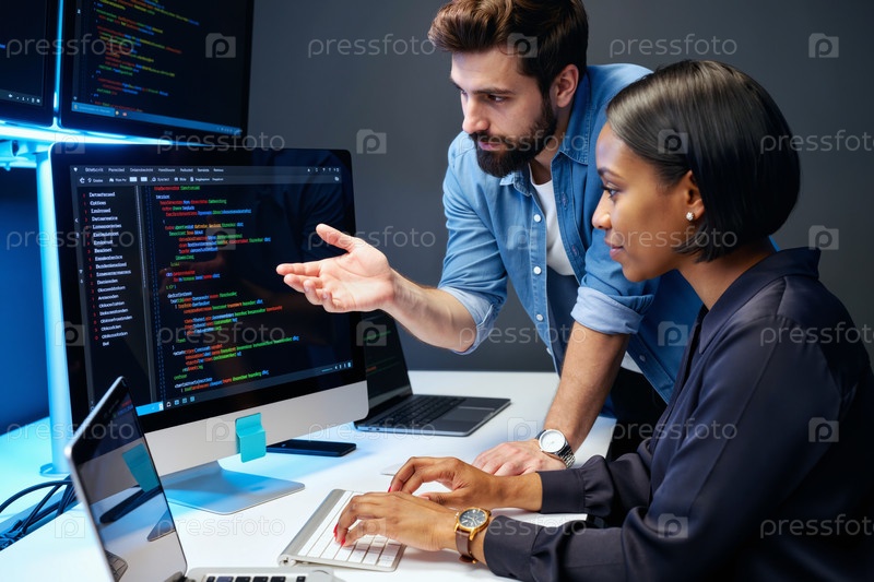 Молодой человек направляет молодую чернокожую женщину писать код на компьютере