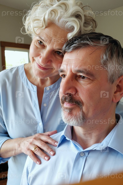Женщина среднего возраста утешает мужчину средних лет в помещении