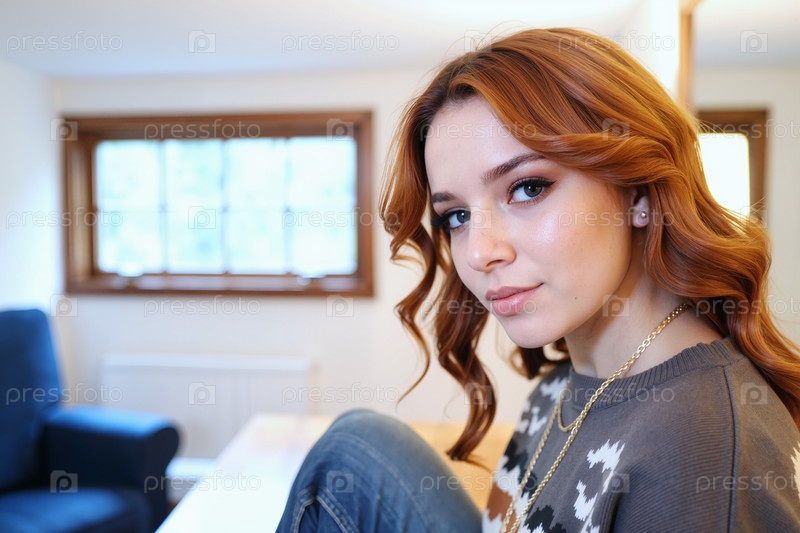Портрет молодой взрослой женщины, сидящей в помещении и смотрящей на камеру