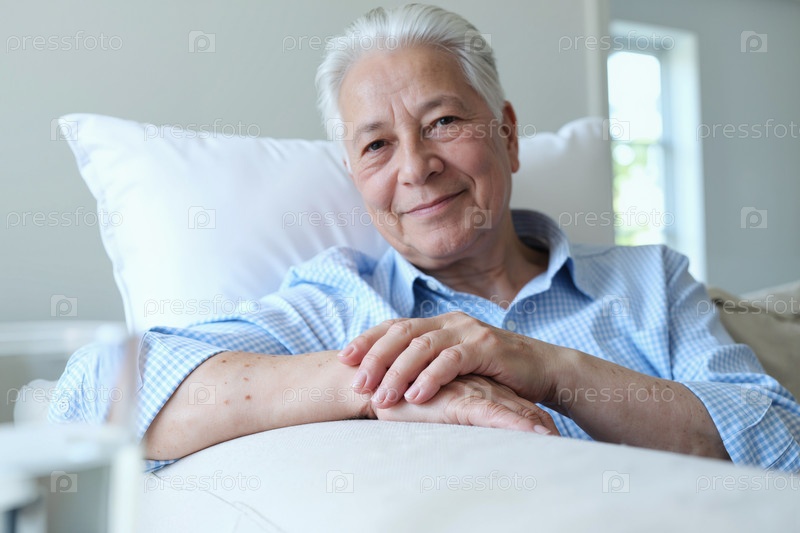 Портрет пожилой женщины, отдыхающей на диване и улыбающейся перед камерой