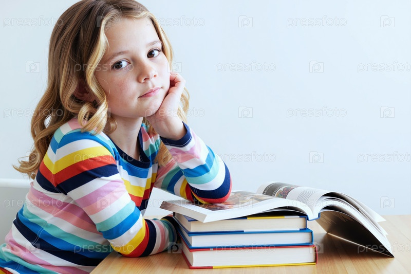 Портрет детской девочки, отдыхающей подбородком на руке во время чтения книг