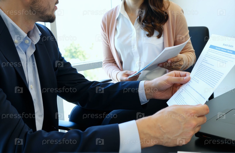 Молодой взрослый мужчина и женщина обсуждают документы во время деловой встречи