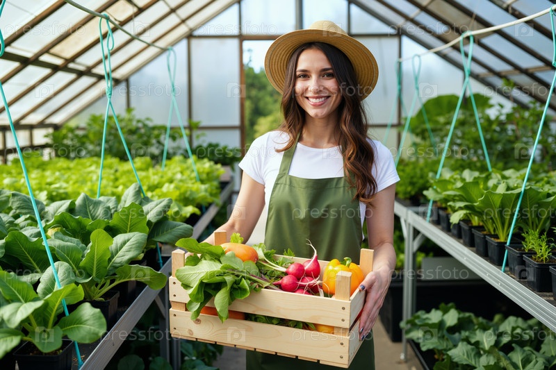 Молодая взрослая женщина держит свежие овощи в теплице улыбаясь