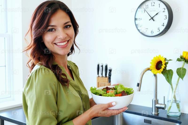 Портрет молодой взрослой женщины, улыбающейся во время приготовления свежего салата