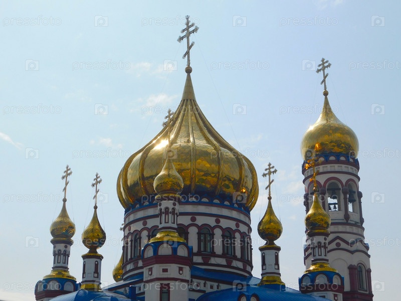 Православная церковь с золотыми куполами и синими крышами
