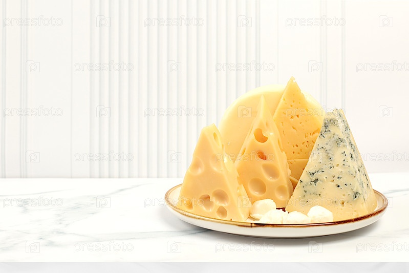 Ассортимент различных видов сыра: синий сыр, горгонзола, рокфорт, пармезан, моцарелла, маасдам на кухонном столе, выбор полезных и натуральных продуктов, рекламные карточки кафе