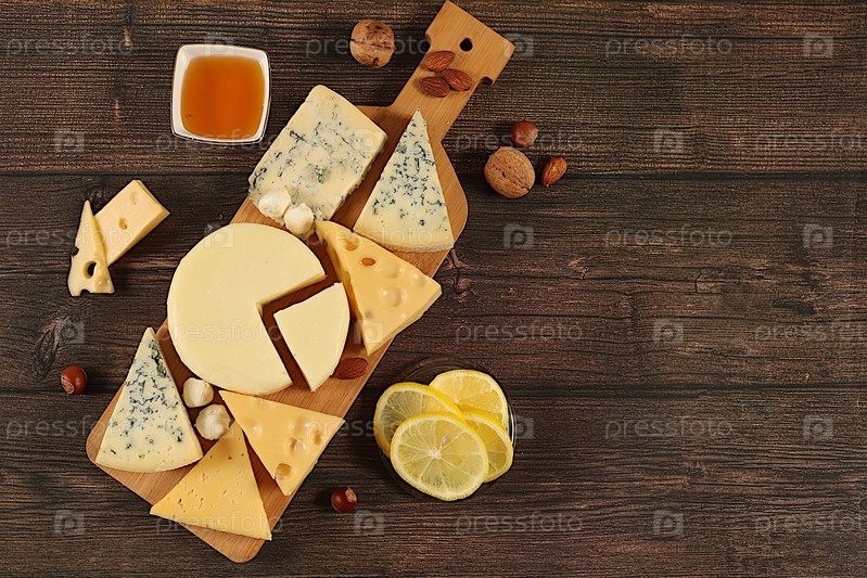 Ассортимент различных видов сыра, синий сыр, горгонзола, рокфорт, пармезан, моцарелла, маасдам с медом и орехами, выбор здоровой и натуральной пищи, рекламные карточки кафе и меню