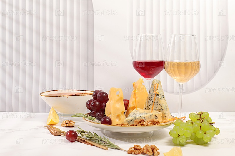 Натюрморт с красивым голубым сыром, пармезаном, виноградом, медом, орехами, розмарином и вином. Сырная тарелка со сезонными закусками, концепция итальянской кухни и меню ресторана и кафе