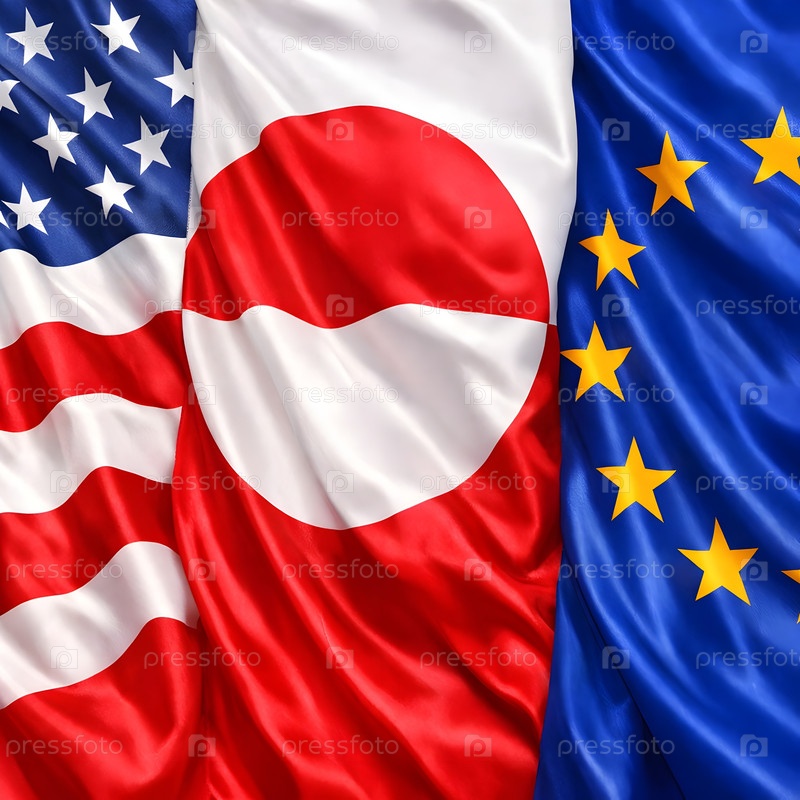 Три флага: Флаг Соединенных Штатов Америки (слева) Флаг Гренландии (в центре) Флаг Европейского союза (справа)