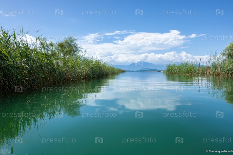 Красивый водный пейзаж с голубым небом и облаками, отражающимися в воде