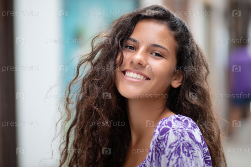 Портрет красивой молодой женщины с длинными кудрявыми волосами, улыбающейся