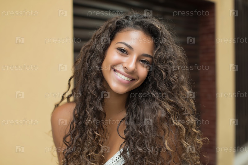 Портрет красивой молодой женщины с кудрявыми волосами, улыбающейся в камеру