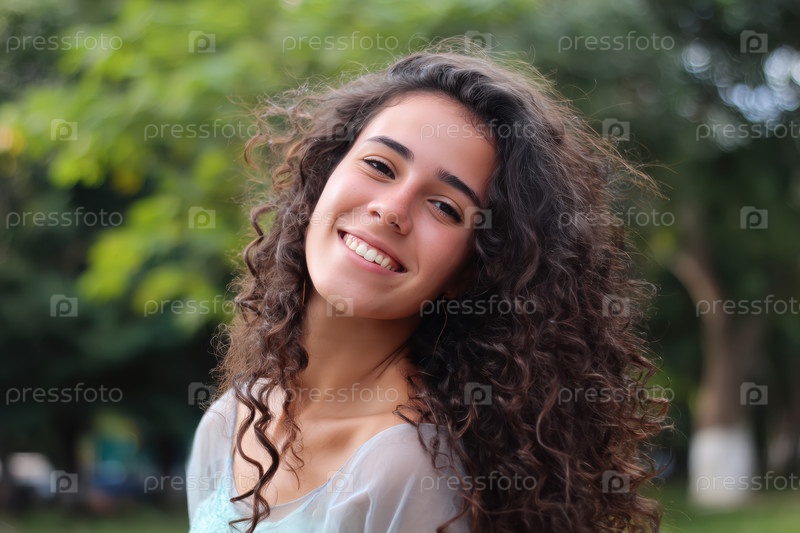 Портрет красивой молодой женщины с кудрявыми волосами в парке