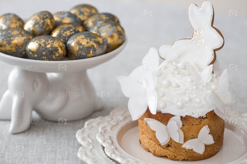 Счастливая Пасха 2026. пасхальный торт с белыми кроликами и бабочками из рисовой бумаги и пасхальными яйцами на светлом мраморном фоне. пасхальные угощения и еда