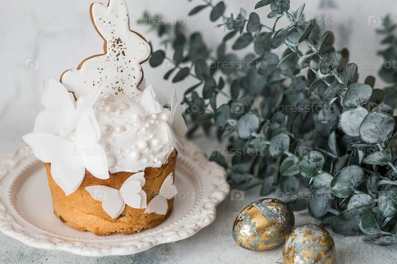 Пасхальные угощения и еда.Счастливого Пасхи 2026.Пасхальный торт с белыми кроликами из пряничного хлеба, бабочками из рисовой бумаги, позолоченными пасхальными яйцами и ветвями эвкалипта на светлом фоне