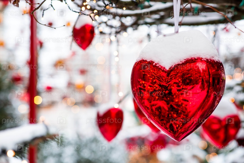 День святого Валентина.Любовь.Праздничный фон с красными стеклянными сердцами, висящими на лентах по улицам города