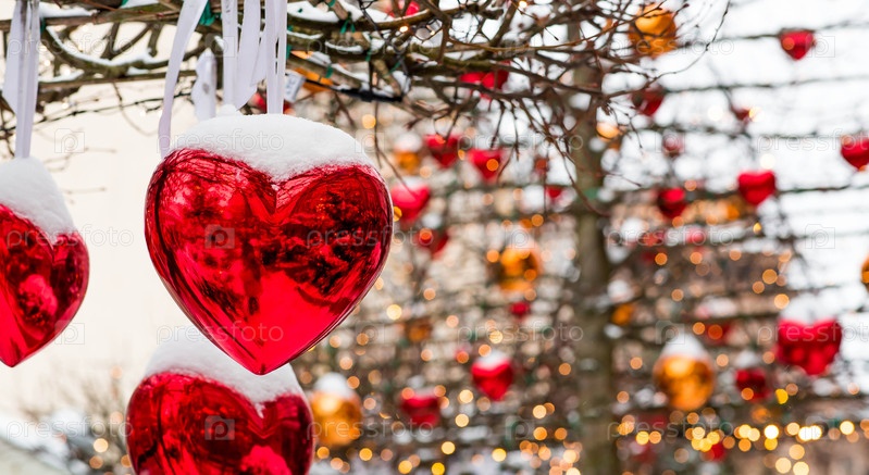 День святого Валентина.Любовь.Праздничный фон с красными стеклянными сердцами, висящими на лентах по улицам города
