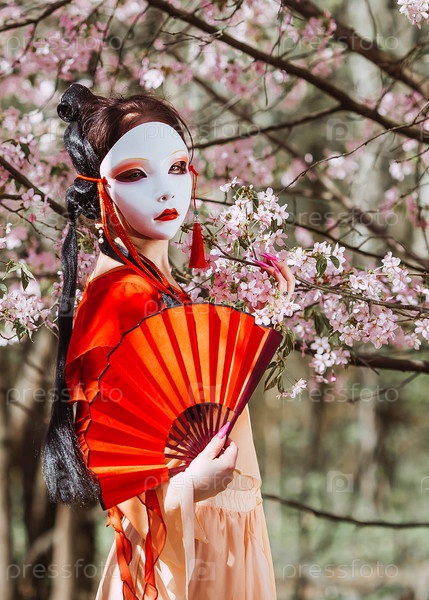 Женщина в японской маске, традиционная одежда и веер в руке, окружена вишней