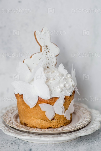 Счастливая Пасха 2026. пасхальный торт с белыми кроликами и рисовыми бабочками на светлом мраморном фоне. пасхальные угощения и еда