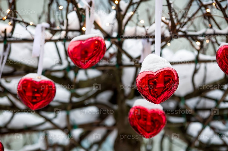 День святого Валентина.Любовь.Праздничный фон с красными стеклянными сердцами, висящими на лентах по улицам города