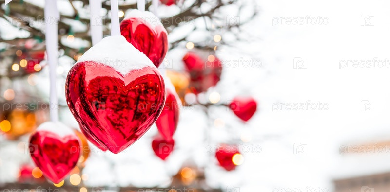 День святого Валентина.Любовь.Праздничный фон с красными стеклянными сердцами, висящими на лентах по улицам города