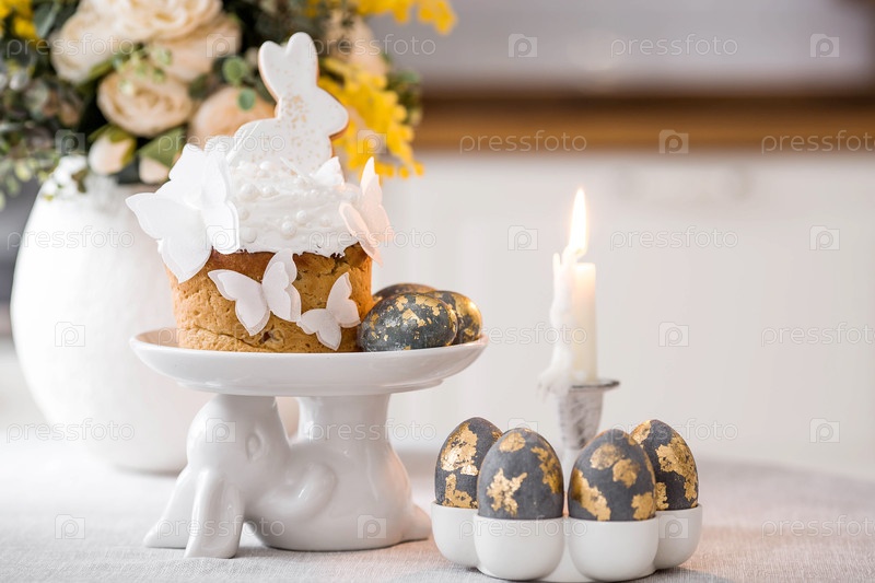 Пасхальное блюдо.Счастливая Пасха 2026.Пасхальный торт с белыми зайцами из пряничного хлеба, бабочками из рисовой бумаги, позолоченными пасхальными яйцами, свечами и весенним букетом на светлом фоне