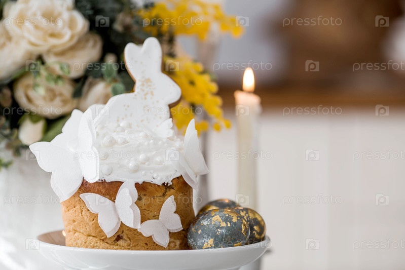 Пасхальное блюдо.Счастливая Пасха 2026.Пасхальный торт с белыми зайцами из пряничного хлеба, бабочками из рисовой бумаги, позолоченными пасхальными яйцами, свечами и весенним букетом на светлом фоне