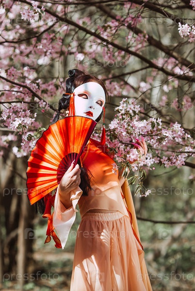 Женщина в японской маске, традиционная одежда и веер в руке, окружена вишней