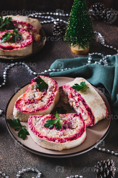 Соленые рулоны с сельдью под салатом из шерсти на тарелке на столе вертикальный вид