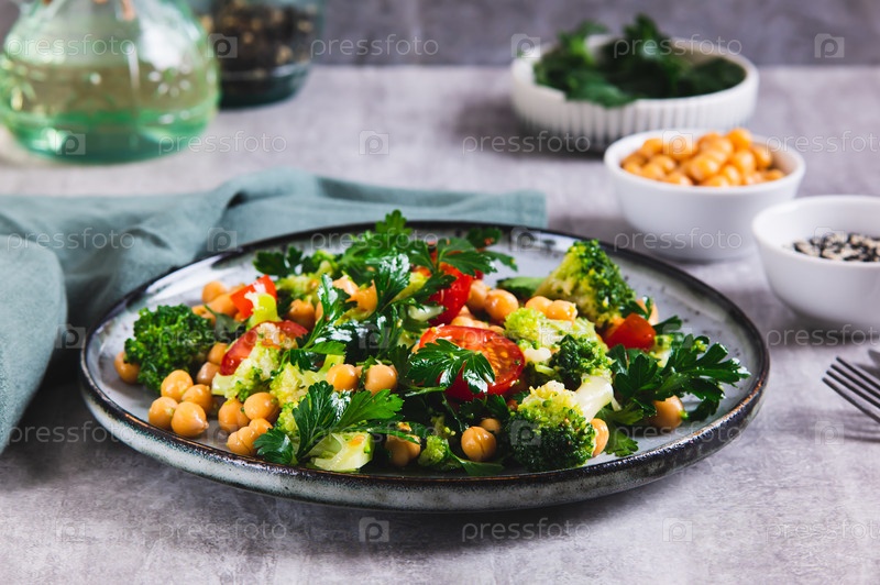 Вегетарианский салат с горохом, помидорами, брокколи и зеленью на тарелке за столом