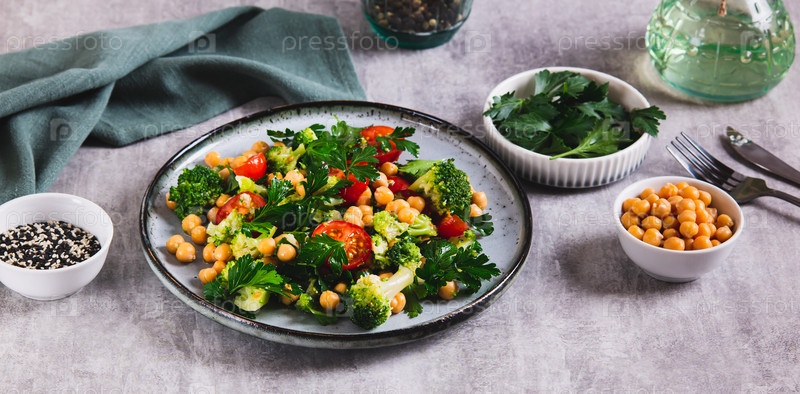 Вегетарианский салат с горохом, помидорами, брокколи и зеленью на тарелке за столом