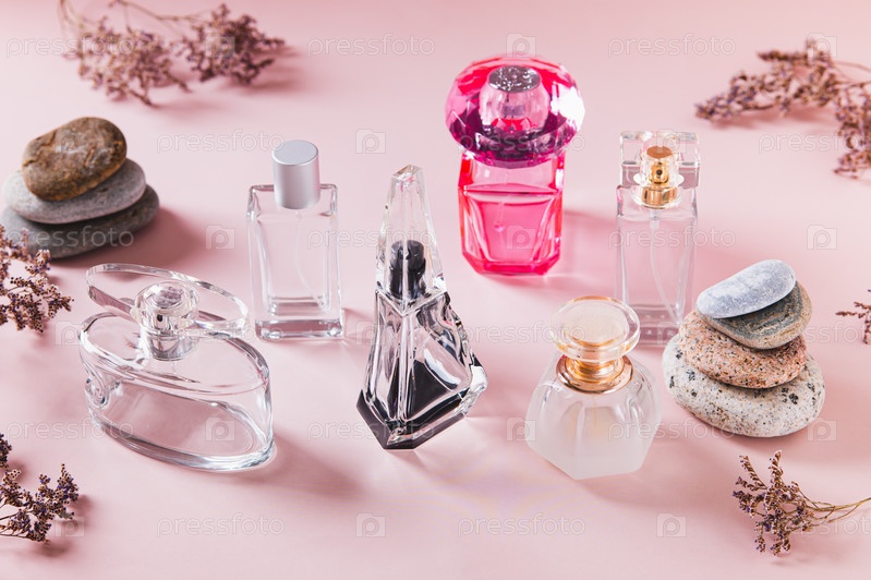 Бутылки с парфюмерией, сушеные цветы и камни на розовом фоне
