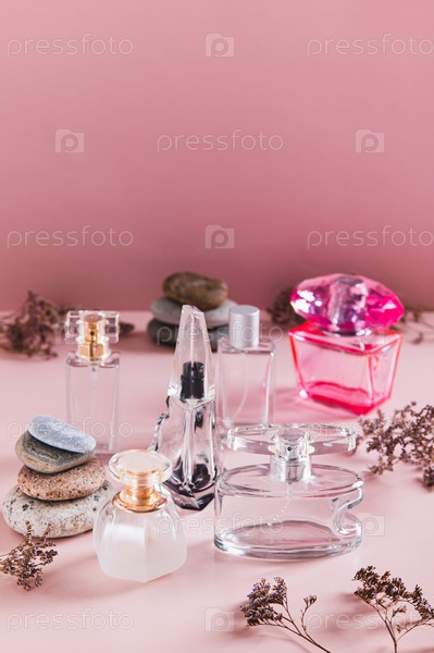 Красивое расположение парфюмерных бутылок в розовых тонах на столе с вертикальным видом