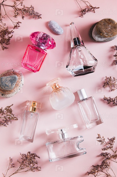 Парфюмерные бутылки, сушеные цветы и камни на розовом фоне сверху и из вертикального вида