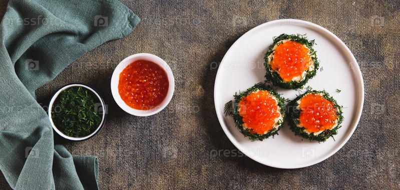 Креативные мини-сэндвичи с красной икры, маслом и укропом на веб-баннере с видом на тарелку