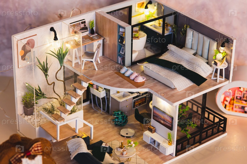 Крошечный двухэтажный шкаф с освещением на столе