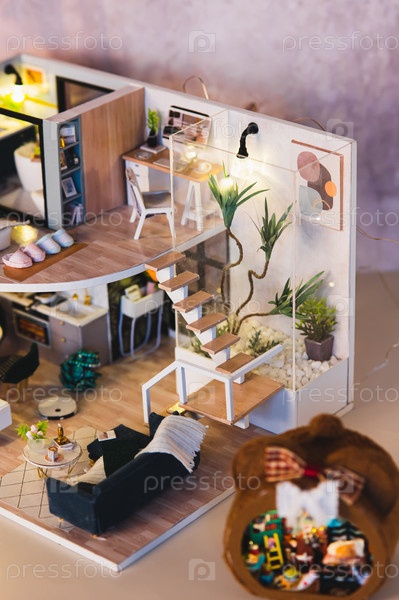 Гостиная, лестница в крошечном доме и миниатюрный шкаф на столе, вертикальный вид