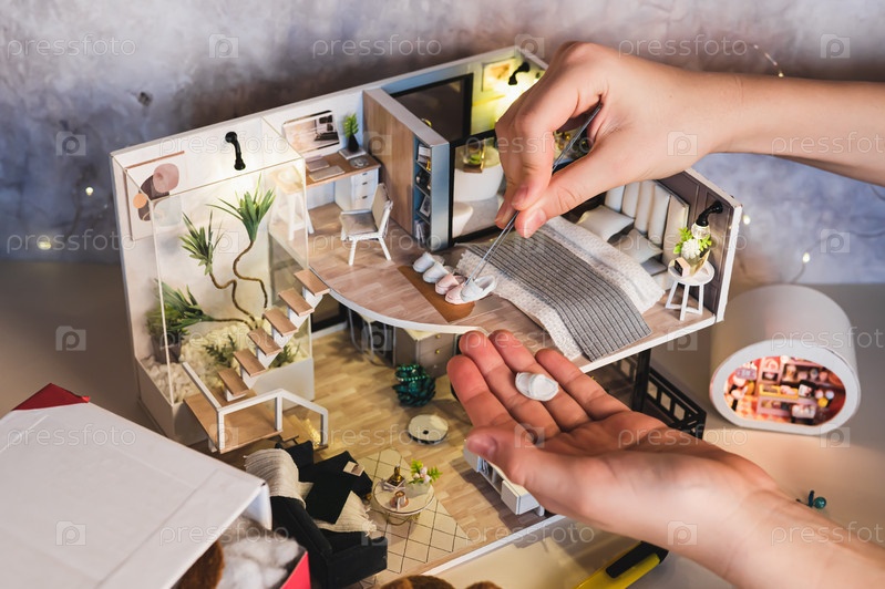 Детские руки ставят тапочки рядом с кроватью в крошечном шкафчике