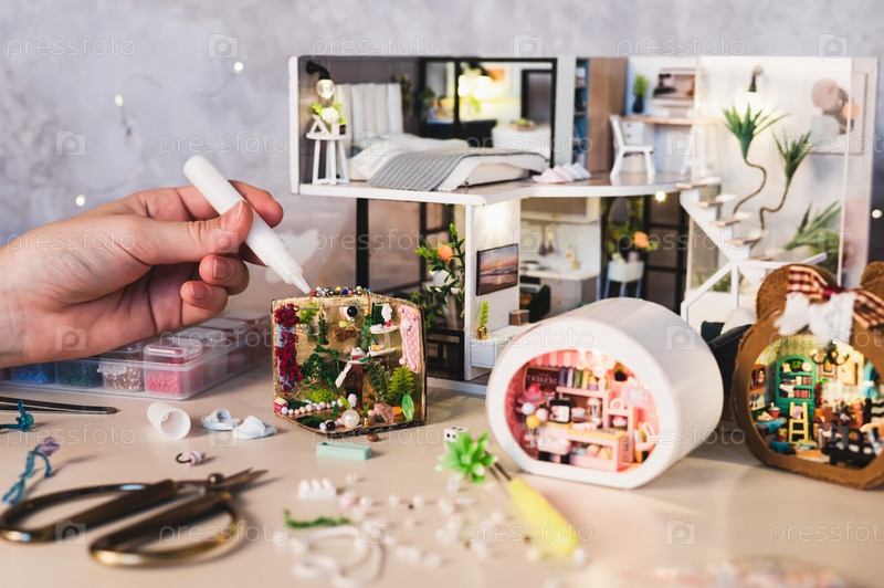 Девушка склеивает кусочки к миниатюрной коробке на столе