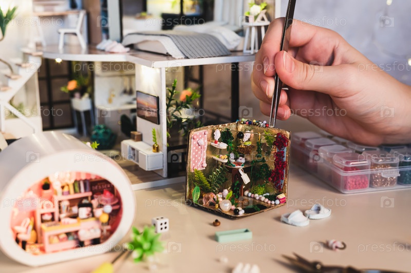 Детская рука использует пинцет, чтобы поместить букет на миниатюрный ящик комнаты