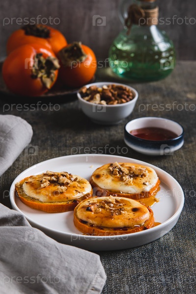 Вкусный выпеченный персимон с творогом, орехами и медом на тарелке вертикальный вид
