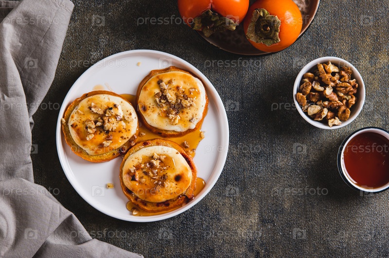 Вкусный выпеченный персимон с творогом, орехами и медом в верхней части тарелки