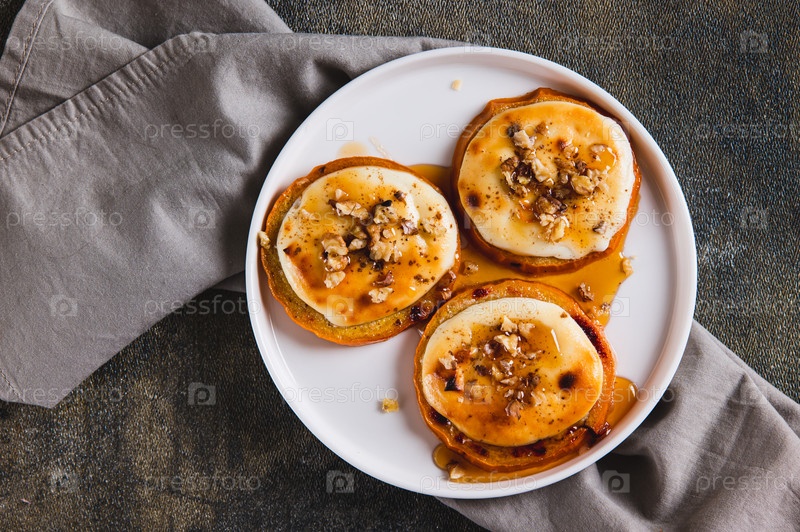 Закройте вкусный выпеченный персимон с творогом, орехами и медом в верхней части тарелки