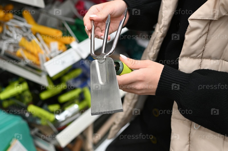 Мужчина осматривает металлический садовый инструмент в розничном магазине.На заднем плане видны полки, наполненные различными садовыми принадлежностями и инструментами, что говорит о оживленной торговой среде