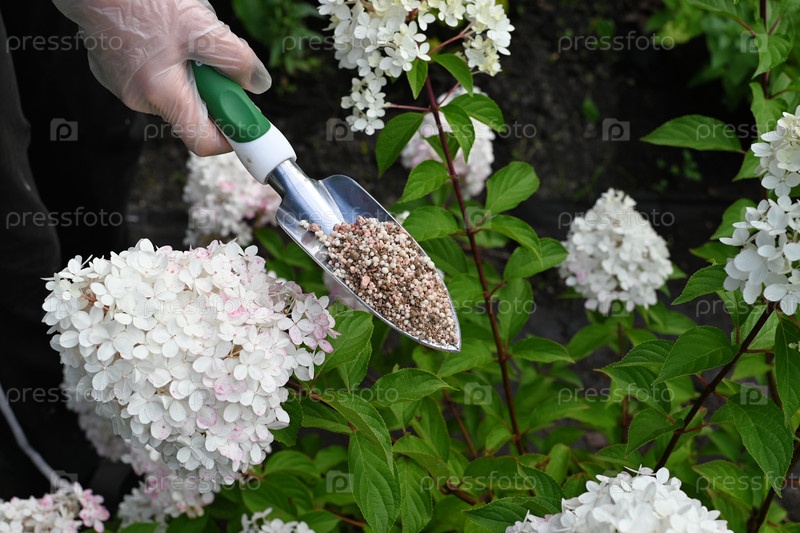 Садовник, применяющий почвенную поправку для цветов гортензии в пышной садовой среде весеннего сезона