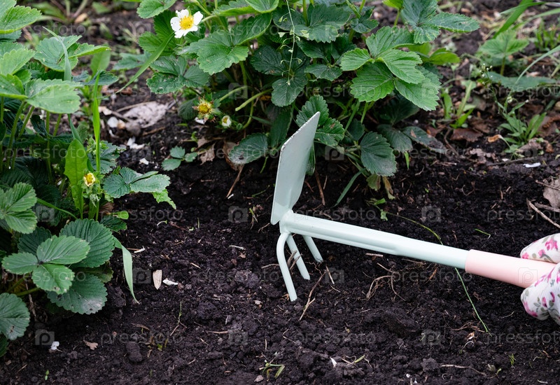 Садовник, выращивающий клубничные растения весной с помощью ручных инструментов в пышном саду
