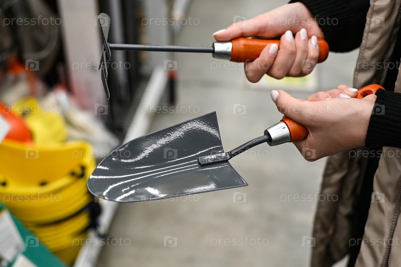 Мужчина держит два садовых инструмента в коридоре магазина.Один из них представляет собой небольшую тротуарную полосу, а другой - грабеж руками.Жестко окрашенные предметы заполняют фон